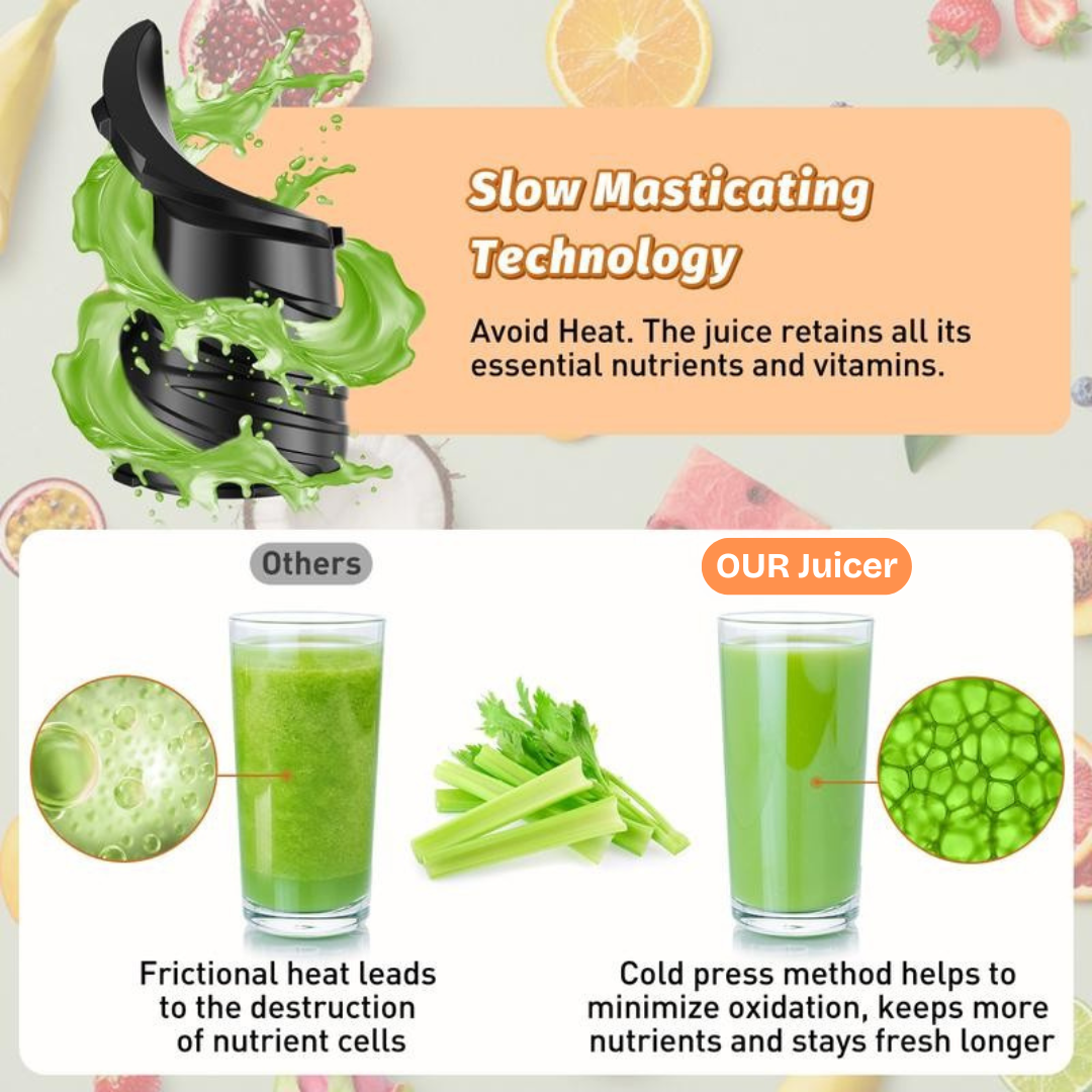 This powerful Cold Press Juicer – Slow Masticating system gives you everything you need to juice without compromise. Designed to extract more nutrients, more flavor, and more juice from every fruit and vegetable, it delivers smooth, vibrant results glass after glass. With a wide feed chute, gentle low-RPM extraction, and easy-clean components, it inspires healthier habits the moment you turn it on. Whether you’re juicing leafy greens, hard vegetables, or fresh fruits, this juicer brings professional-level performance to every kitchen.